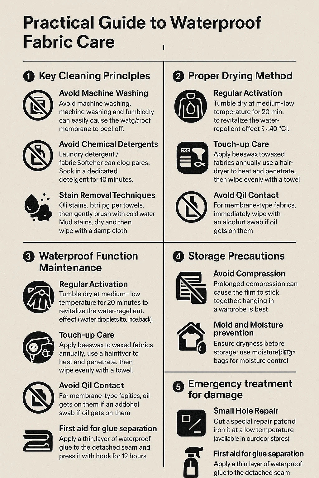 Hindari Pencucian dengan Mesin: Pencucian dengan mesin dan pengeringan dengan mesin dapat dengan mudah menyebabkan membran kedap air terkelupas. Mencuci tangan dan menggosok dengan lembut adalah pilihan yang paling aman.
