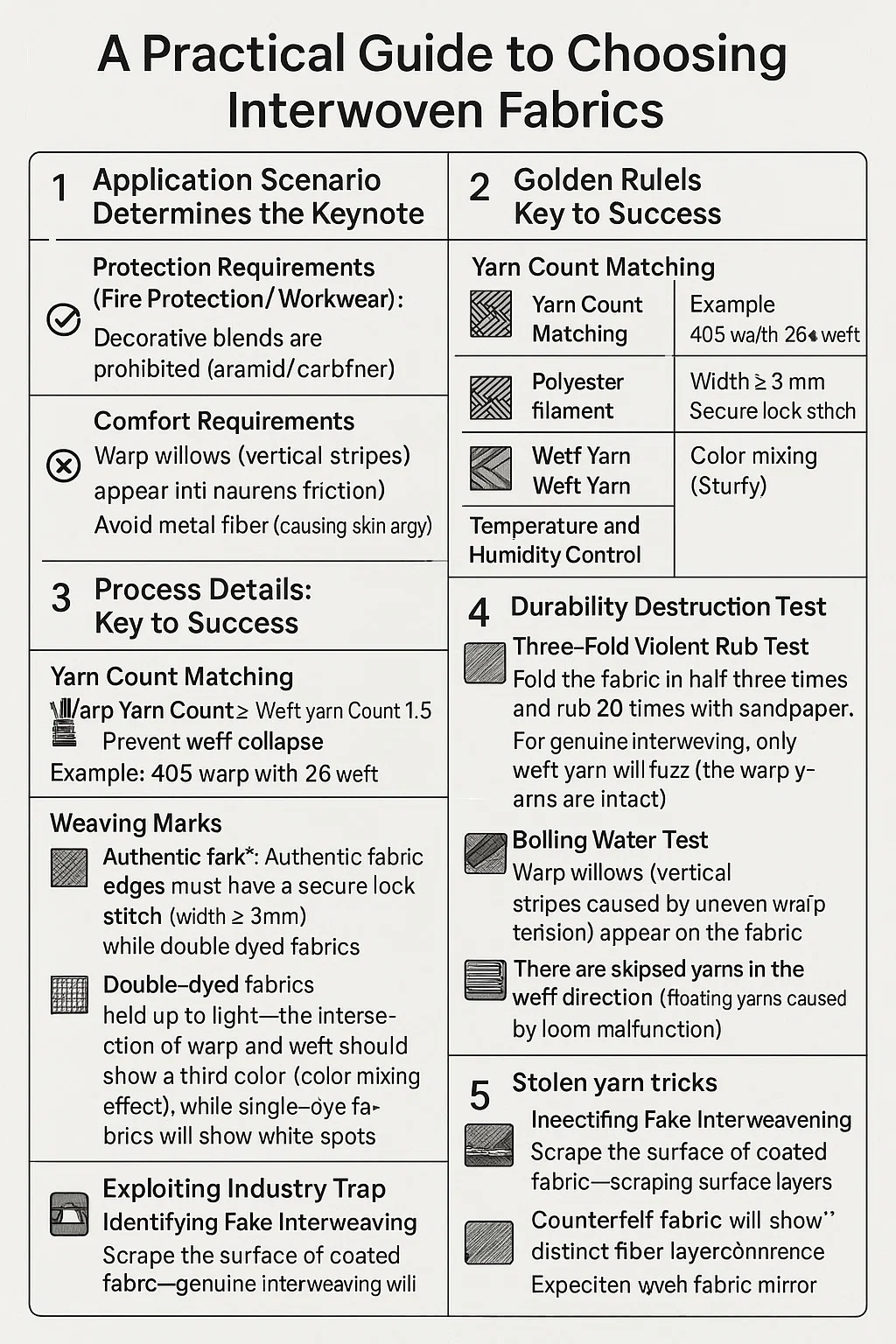 Persyaratan Perlindungan (Perlindungan Kebakaran/Pakaian Kerja): Benang lusi harus terbuat dari serat berkekuatan tinggi (aramid/serat karbon). Campuran dekoratif dilarang (tingkat perlindungan berkurang).