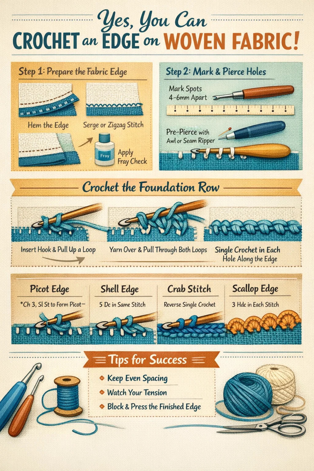Merajut tepinya kain tenun sepenuhnya mungkin dan menghasilkan hasil akhir dekoratif yang halus yang juga mencegah keretakan. Kuncinya adalah mempersiapkan kain dengan benar, menggunakan ukuran kait yang tepat, dan mengerjakan baris dasar jahitan rajutan tunggal secara merata di sepanjang tepinya sebelum membuat pola dekoratif di atasnya. Kebanyakan perajin menemukan bahwa a Kait rajutan ukuran AS D/3 (3,25 mm) hingga F/5 (3,75 mm). cocok untuk kain tenun berbobot sedang, namun Anda harus selalu mengujinya pada potongan kain bekas terlebih dahulu.