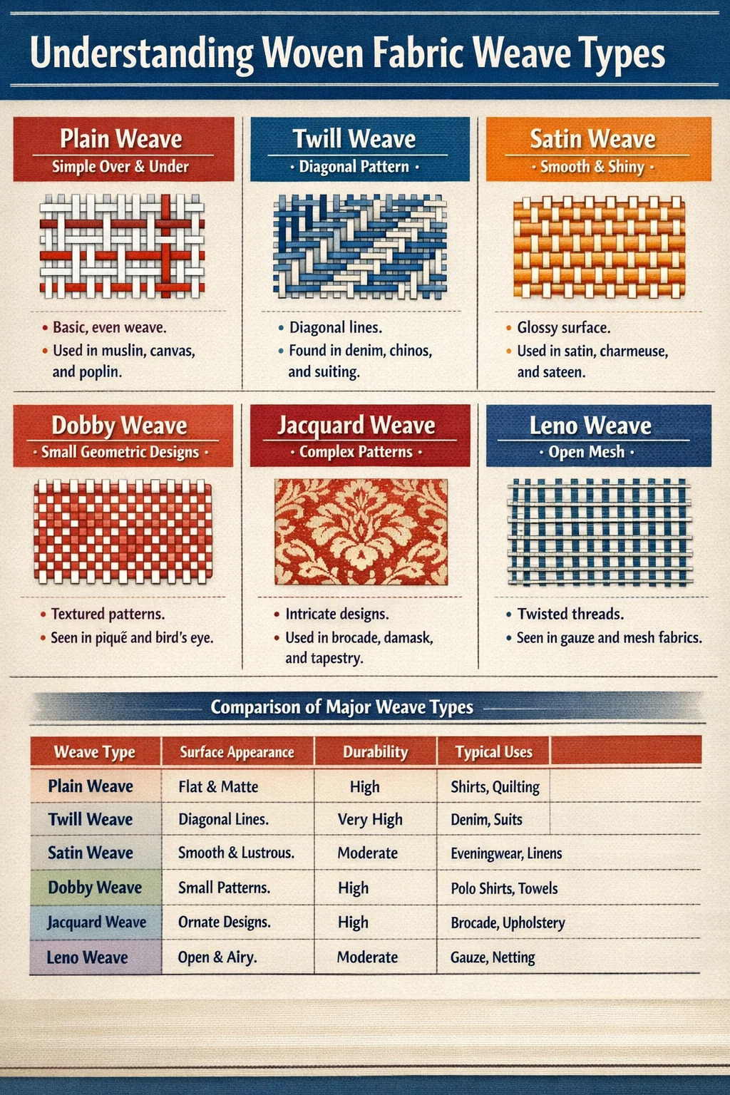 Tabel di bawah ini merangkum sifat-sifat utama dan kegunaan umum dari masing-masing jenis tenunan utama untuk mempermudah perbandingan langsung.