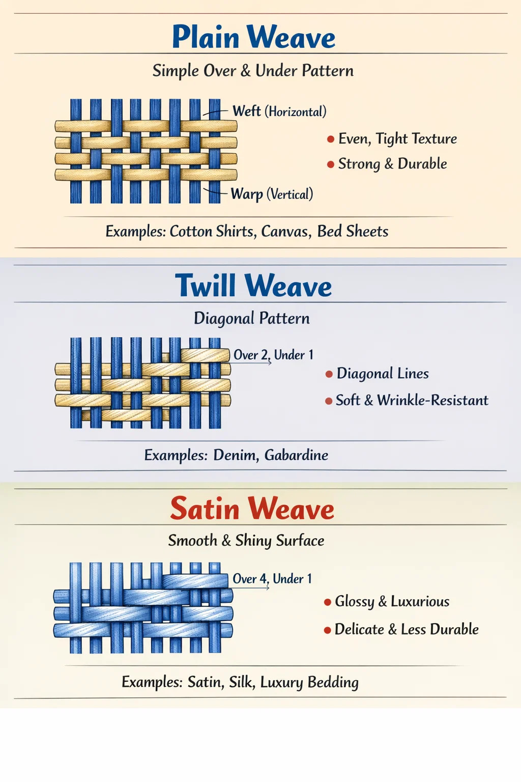 Contoh Kehidupan Nyata: Bahan satin yang digunakan dalam pernikahan atau piyama sutra. Jika Anda melihat "tenunan satin katun stapel panjang" pada kemasan sprei, artinya selimut penutupnya akan terasa sehalus sutra.