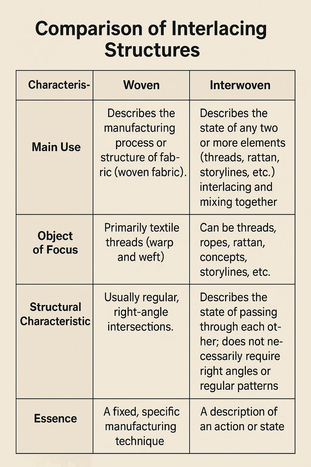 • Konsep dasar: Secara khusus mengacu pada metode pembuatan kain (seperti kain tenun), menggunakan alat tenun untuk menjalin dan menumpang dua set benang—benang lusi (benang memanjang) dan benang pakan (benang melintang)—dengan sudut siku-siku.