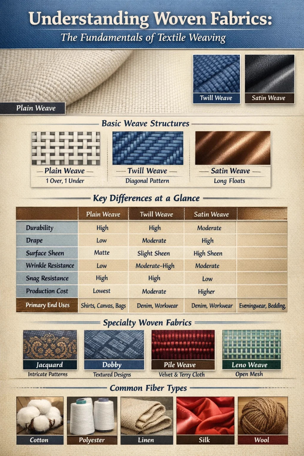 Tabel di bawah menguraikan perbedaan praktis antara tenunan polos, tenunan kepar, dan tenunan satin berdasarkan sifat-sifat yang paling penting dalam pengambilan keputusan pengadaan dan produksi: